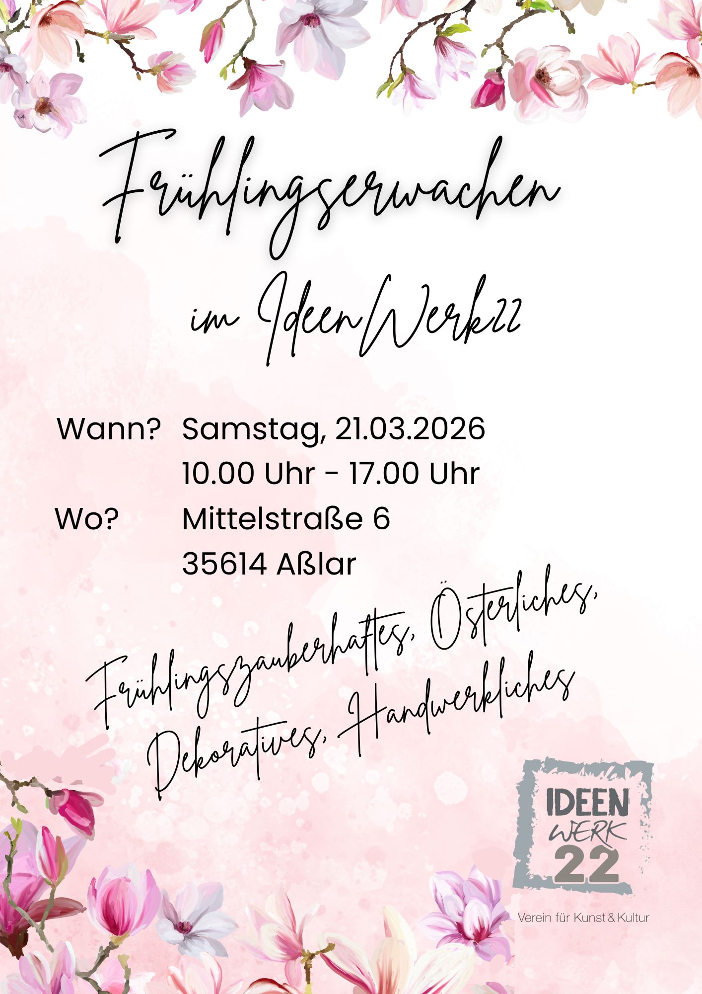 Veranstaltungen 21.03.2026 Frühlingserwachen im IdeenWerk Regelmäßig am 2. Mittwoch im Monat:Kreativ-Café für jeden, ohne Anmeldung – ohne Kosten!Lockeres Beisammensein zwischen 15 und 17 Uhr – ob mit Stricksachen, anderen Handarbeiten oder einfach so – wir heißen euch herzlich Willkommen. Anzahl der Besucher: 6.186